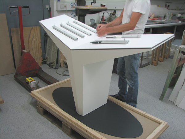 Sockel-Exponate / Eyecatcher /Pult- und Sideboardlösungen mit Funktion und LED-Beleuchtung. Materialkombinationen Plexiglas / Acryl, MDF, Ureol, Schock-Kugelführungen. Transportkisten für Mehrfachverwendung.